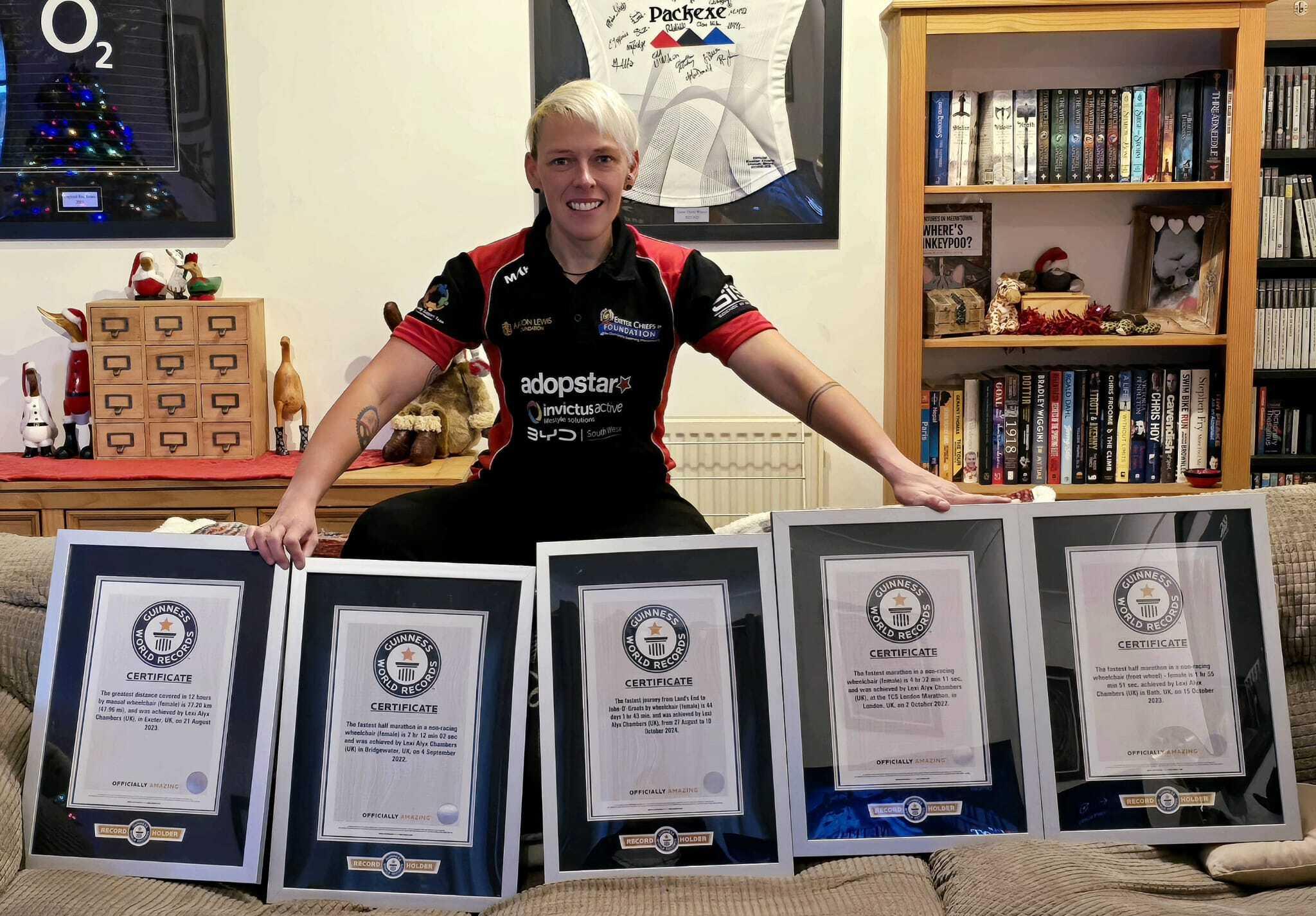 - 2023: Set 2 more Guinness World Records - covering the greatest distance in 12 hours with a standard wheelchair and completing the Bath Half Marathon, raising £3,448 for the Aaron Lewis Foundation.