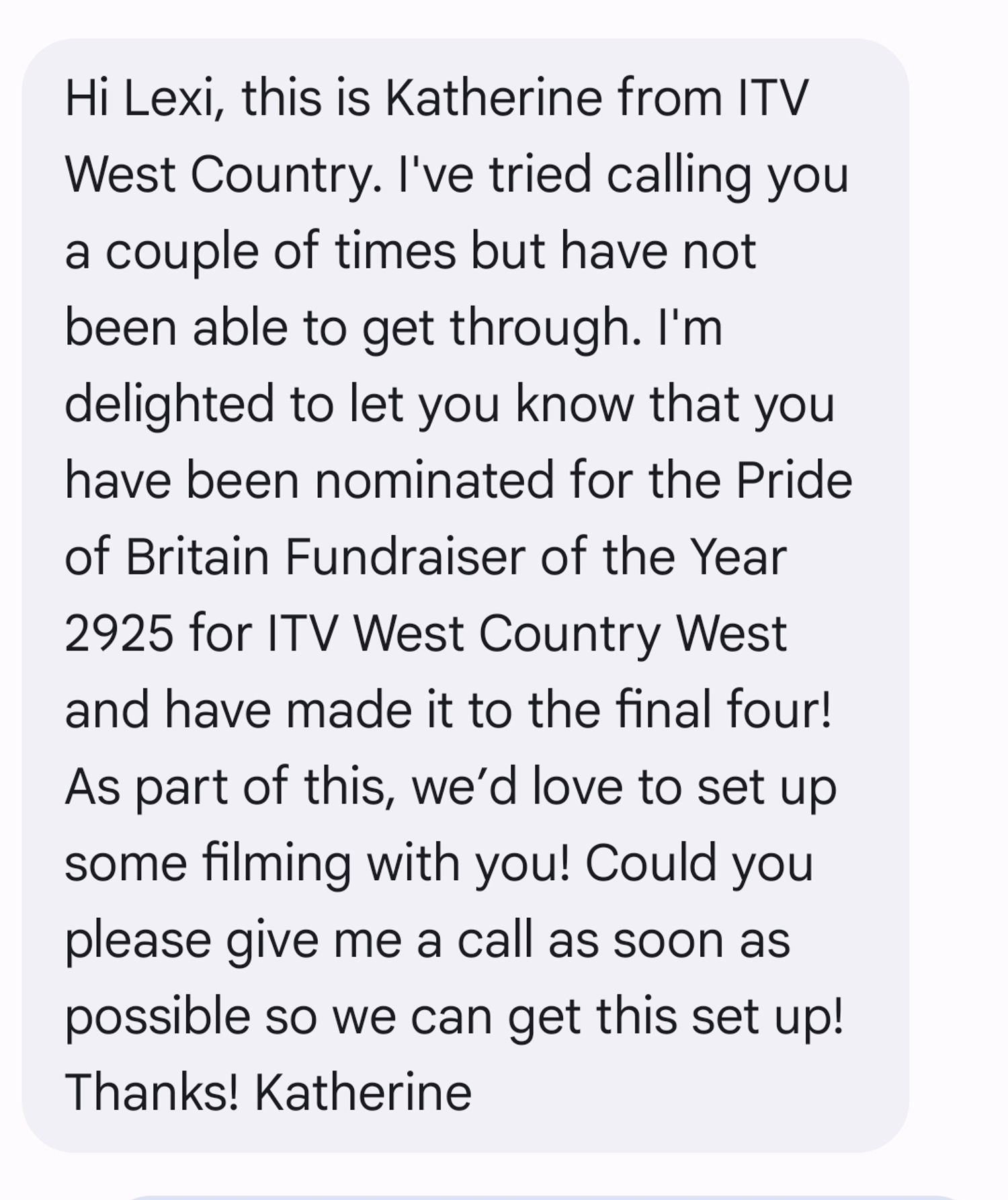 Hotel tonight is a vast improvement, gluten-free food, actual comfort, and the luxury of not sticking to the bedsheets. Bonus: had a call from BBC West Country to let me know I’ve made the final four of the Pride of Britain Awards for fundraising. At first, I thought it was a prank. I had to read the message six times before believing it. But no, it’s real. Which means London, ceremonies, and possibly trying to sit still in formalwear. Gobsmacked doesn’t cover it. Excited? Definitely. Terrified? Also yes. But theres no guarentee ill make it any further. But the nomination was nice.