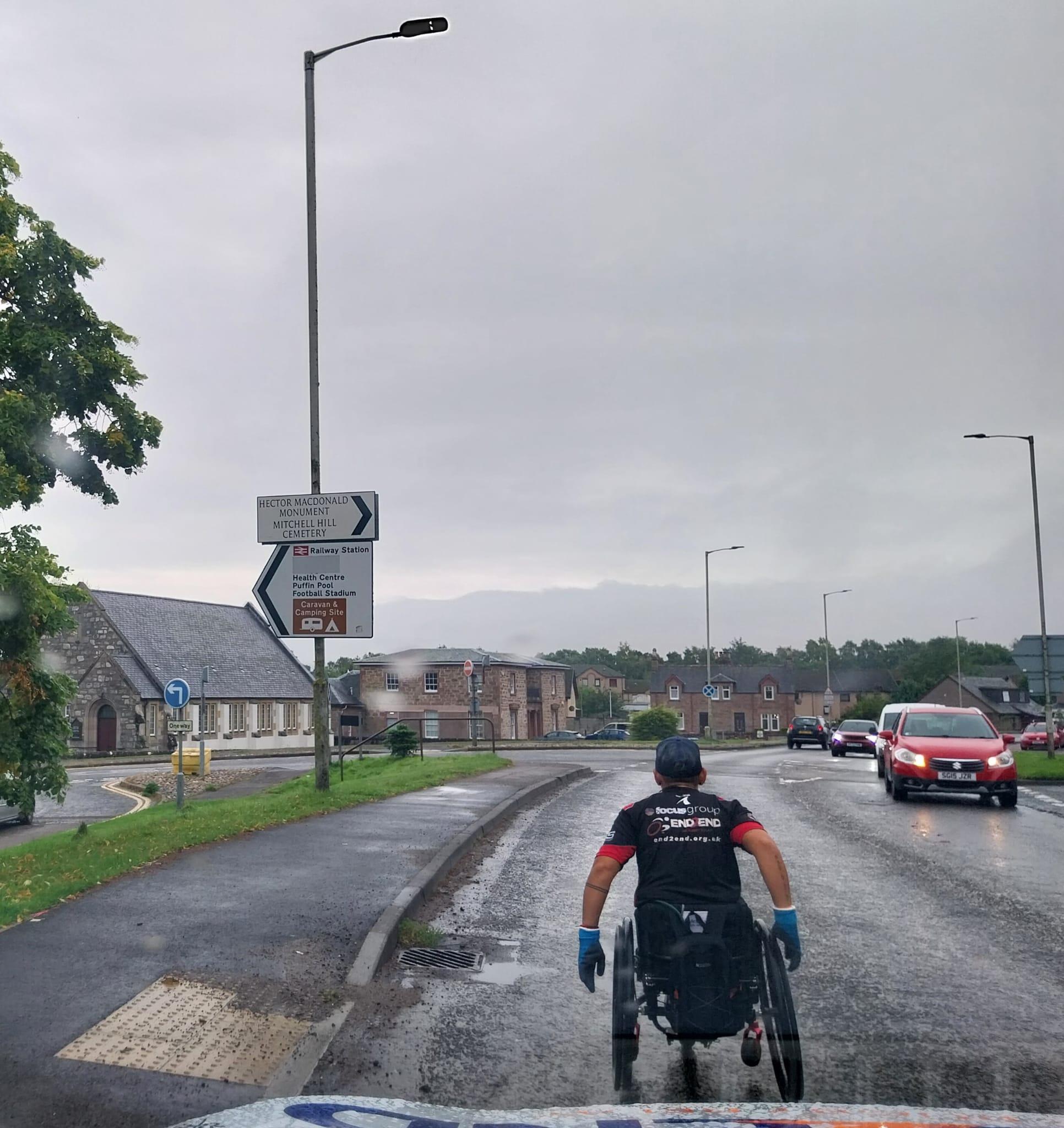 So I began wheeling. It was that drizzly rain, that gets you soaked through, even though you don't think it will. After only a few minutes my hands were slipping on the push rims, but it was a fairly good road, so I wanted to carry on. I wheeled through a a town, and then a busy road. Negotiated my 1st large roundabout, and then into another town. Had some lovely shouts of encouragement, and even got stopped again with someone wanting to give a donation. A lovely lady called Helen, who I chatted with for a few minutes whilst having a flapjack. Pam's are all gone now, so I'm stuck with very dry ones! 🤦♂️ I am always shocked when people give donations on the road. But so far we have received one every day! Which is amazing.