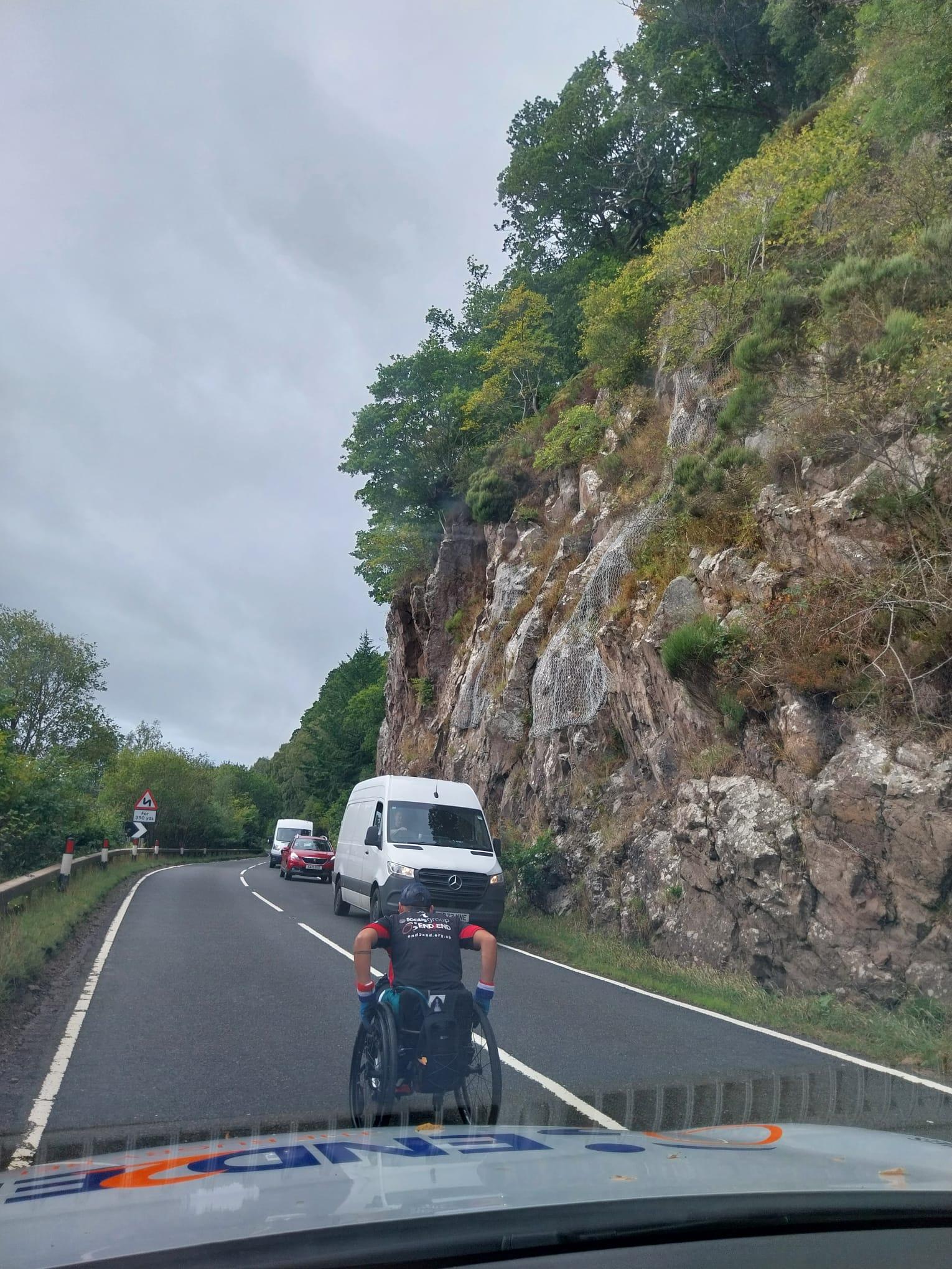 I wheeled through a lovely village. I think it was Loch Ness? The people were amazing. They were clapping and cheering as I went through. I'm not sure how they found out about the event? As far as I know, it's not even in the media here. But they were amazing. Really kind and super supportive. It really spurred me on. I wheeled right through this amazing place. I knew I didn't have much longer to go. Then I got the bad news. The road ahead was so busy, that it was too dangerous to stop when I needed to. So I ended up wheeling 43.5km. So only 1.5km longer than necessary. But when your in that much pain, it's really tough!